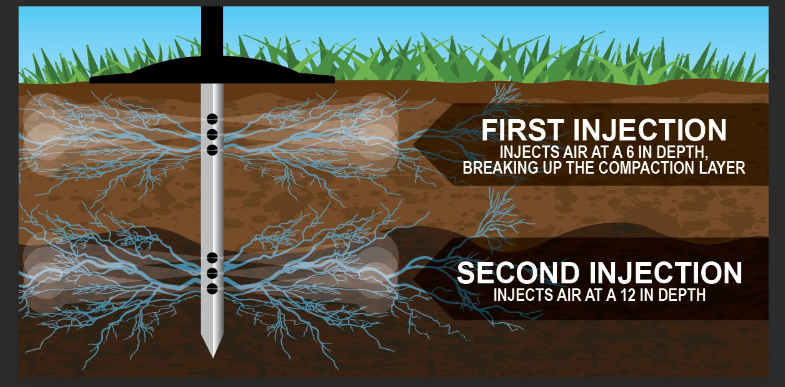 April 15th will see the greens being aerated with the Air-2-g2. This has been used on an annual basis to aerate greens rather than punch lots of deep holes across the green, ( which not only affects ball roll but also creates lots of holes ideal for many unwanted pests to lay their eggs) it has 3 spikes at a length of 12 inches that each make a small hole and then with an onboard compressor, air is blasted when the spikes reach their full depth whilst also blasting through another 3 holes further up the spike 6 inches from the surface, this help eradicate surface compaction with very little disruption to the surface. The process should take 1-2 days and disruption to play will be very minimal.
